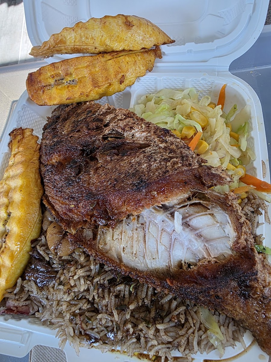 My husband and I decided to try this new restaurant to support a black business in June for Alpha Kappa Alpha Sorority Inc black business activity. The food was delicious and authentic. We bought the rice and peas and jerk chicken and the fried fish and white rice. The fish and jerk chicken is well seasoned and very delicious. I also enjoyed the white rice and the vegetables and plantains. My husband enjoyed the rice and peas and plantains too. We enjoyed it so much we came back. We highly recommend this restaurant. The service was great and the food delicious.